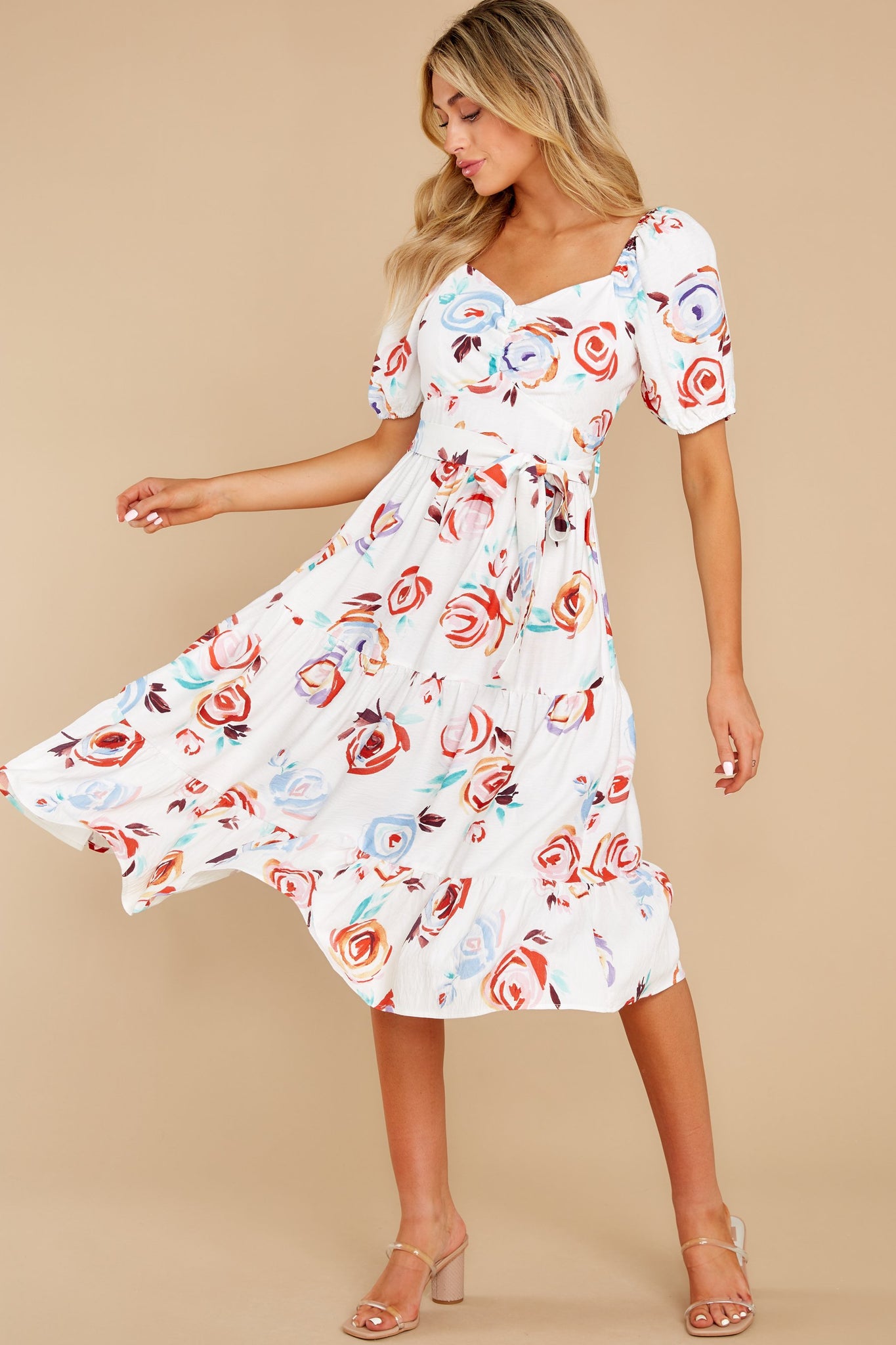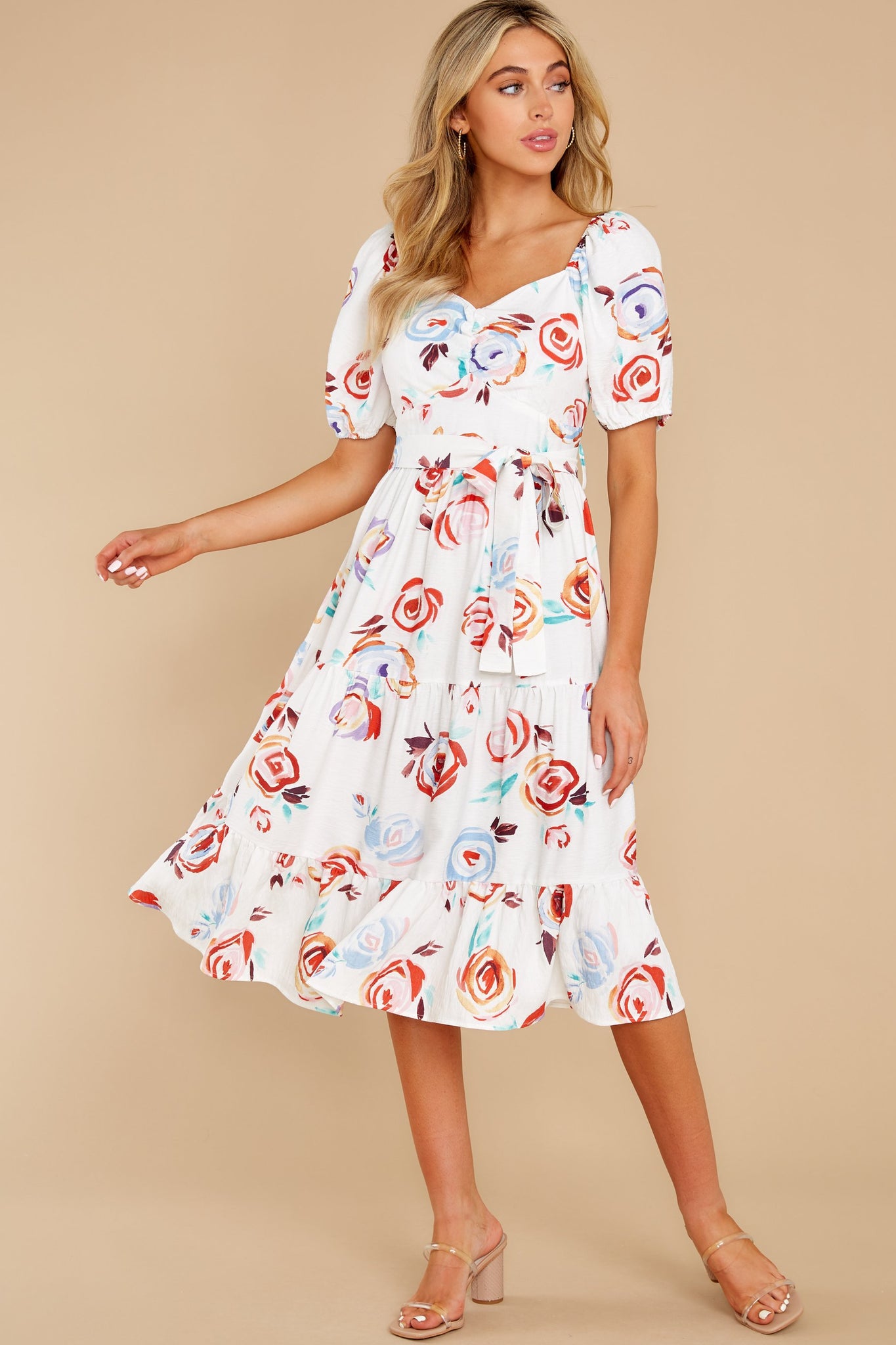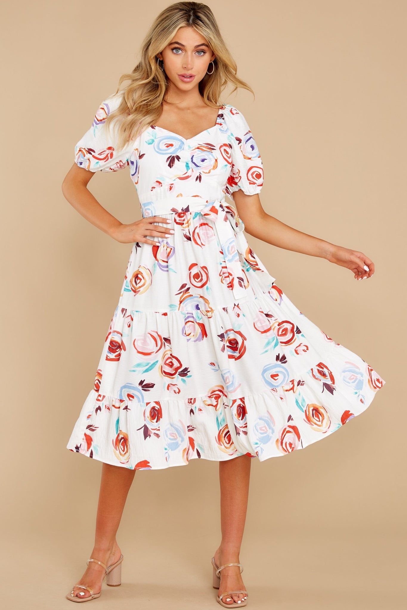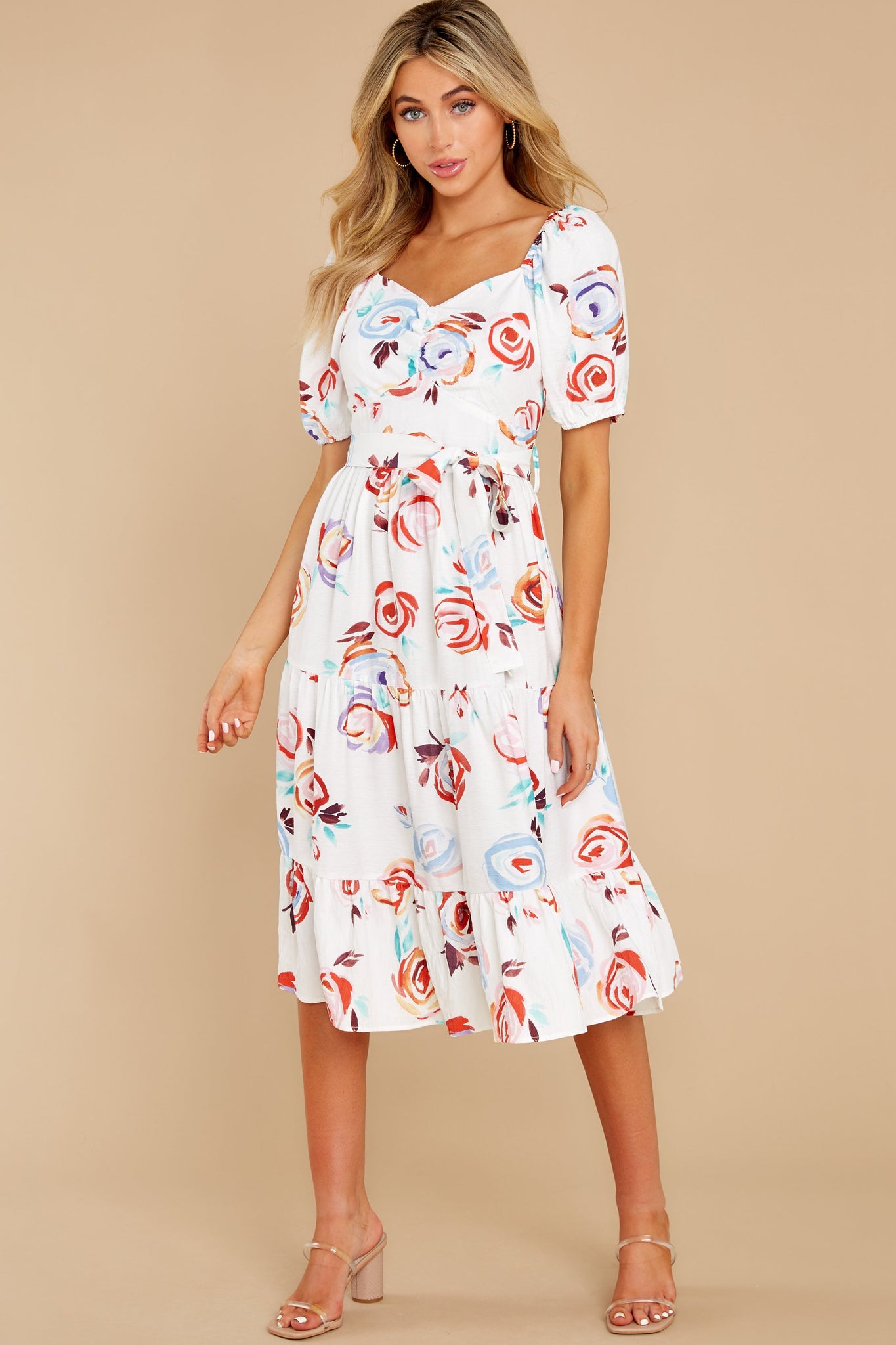 With a snap of your fingers, he's gonna fall right Into Your Arms when he takes one glance at you wearing this lovely midi dress. Darling, your classy style and this breathtaking dress are simply made to sweet him off his feet. Floral print dress features an optional off-the-shoulder design with elastic shoulder detailing, a sweetheart neckline, short sleeves bubble completed by elastic cuffs, zipper backing, a gathered (non-elastic) waistline complete with a matching fabric belt, and a gathered tiered midi skirt. Model is wearing a small. ? 90% Viscose 10% Polyamide ? Machine Wash Cold ? Unlined ? Imported