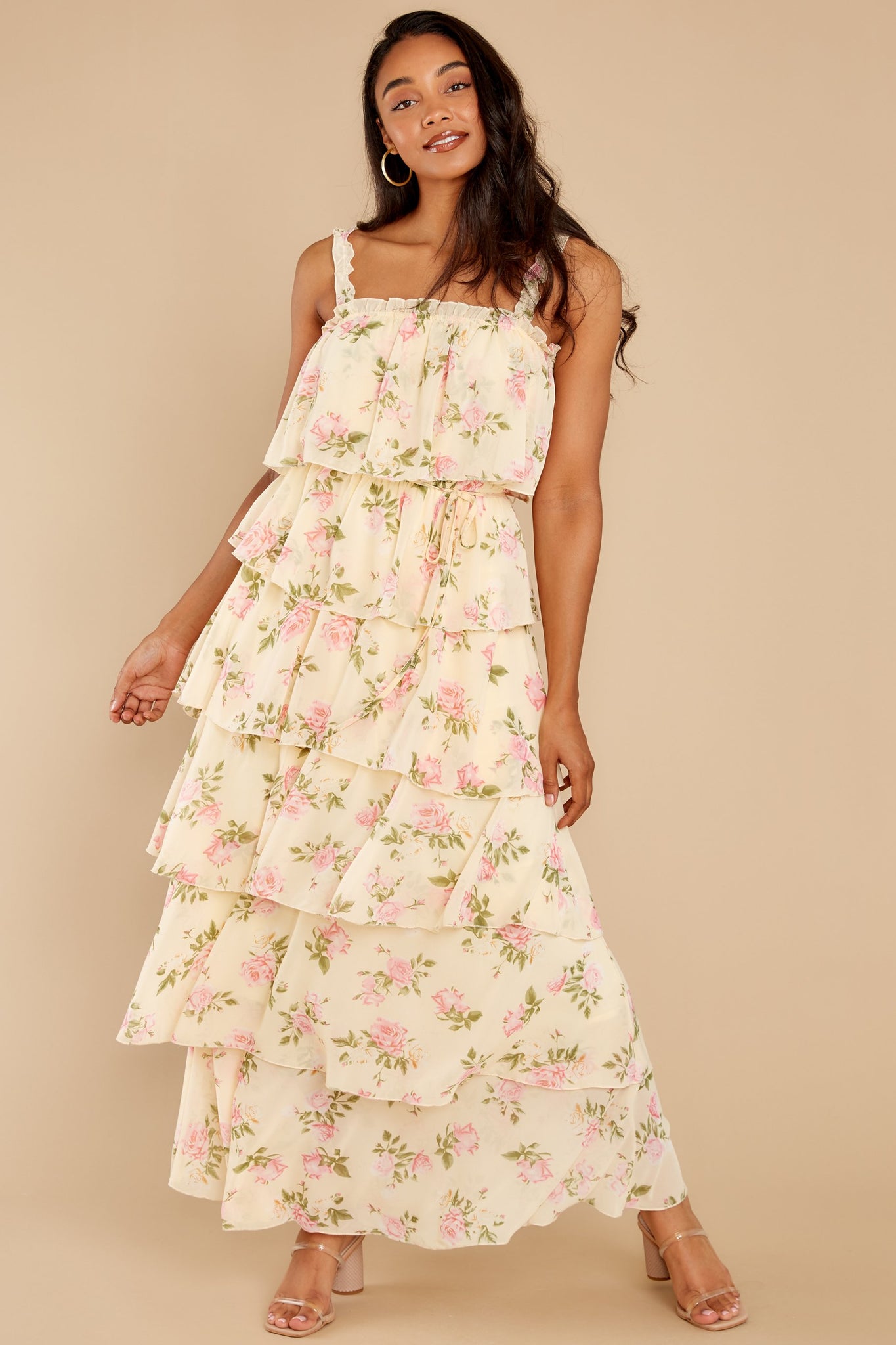 Though you Make It Look Effortless, we know that being so magnificent took a bit of work¡at first. But when you wear this striking maxi dress, you make even magnificence stop and stare.?It¡¯s no wonder fashion?comes to you so willingly these days. Floral print maxi dress features an elastic ruffle neckline, thin (non-adjustable) ruffle elastic straps, an elastic waisltine, an included matching belt, and a layered tier maxi skirt. Model is wearing a medium. ? 100% Rayon ? Hand Wash Cold ? Lined ? Imported