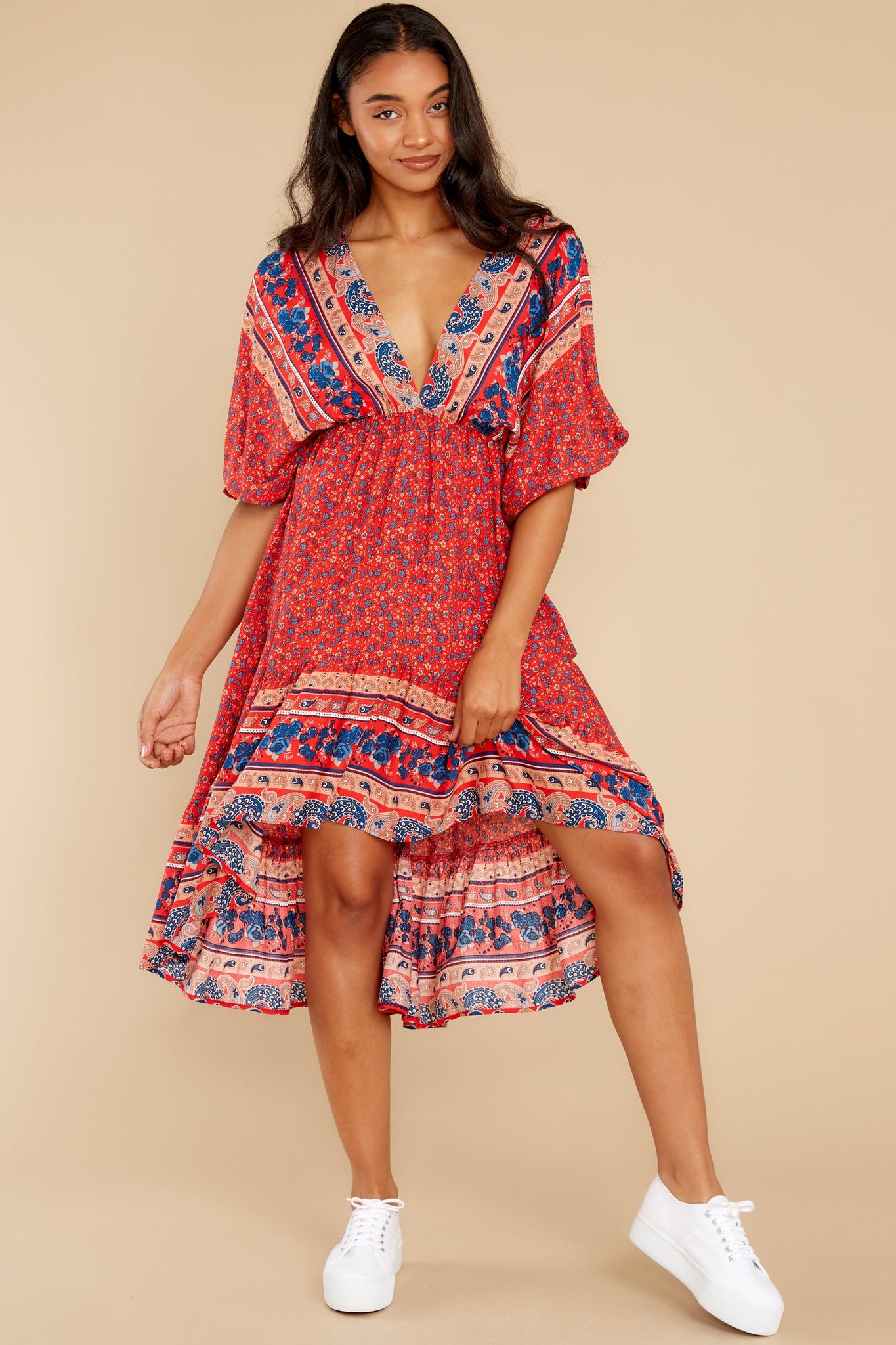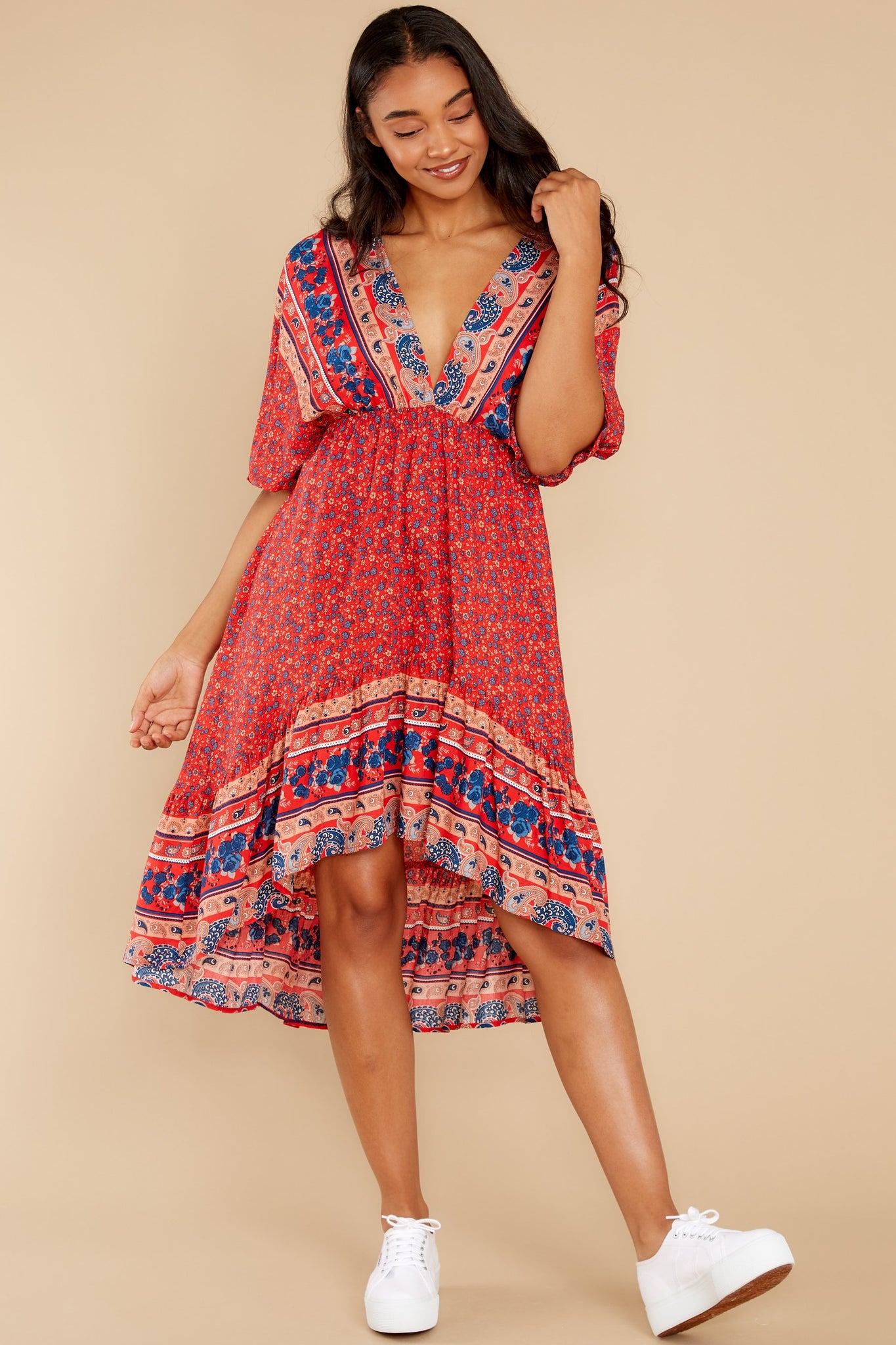 Out Of Envy Red Multi Print Midi Dress