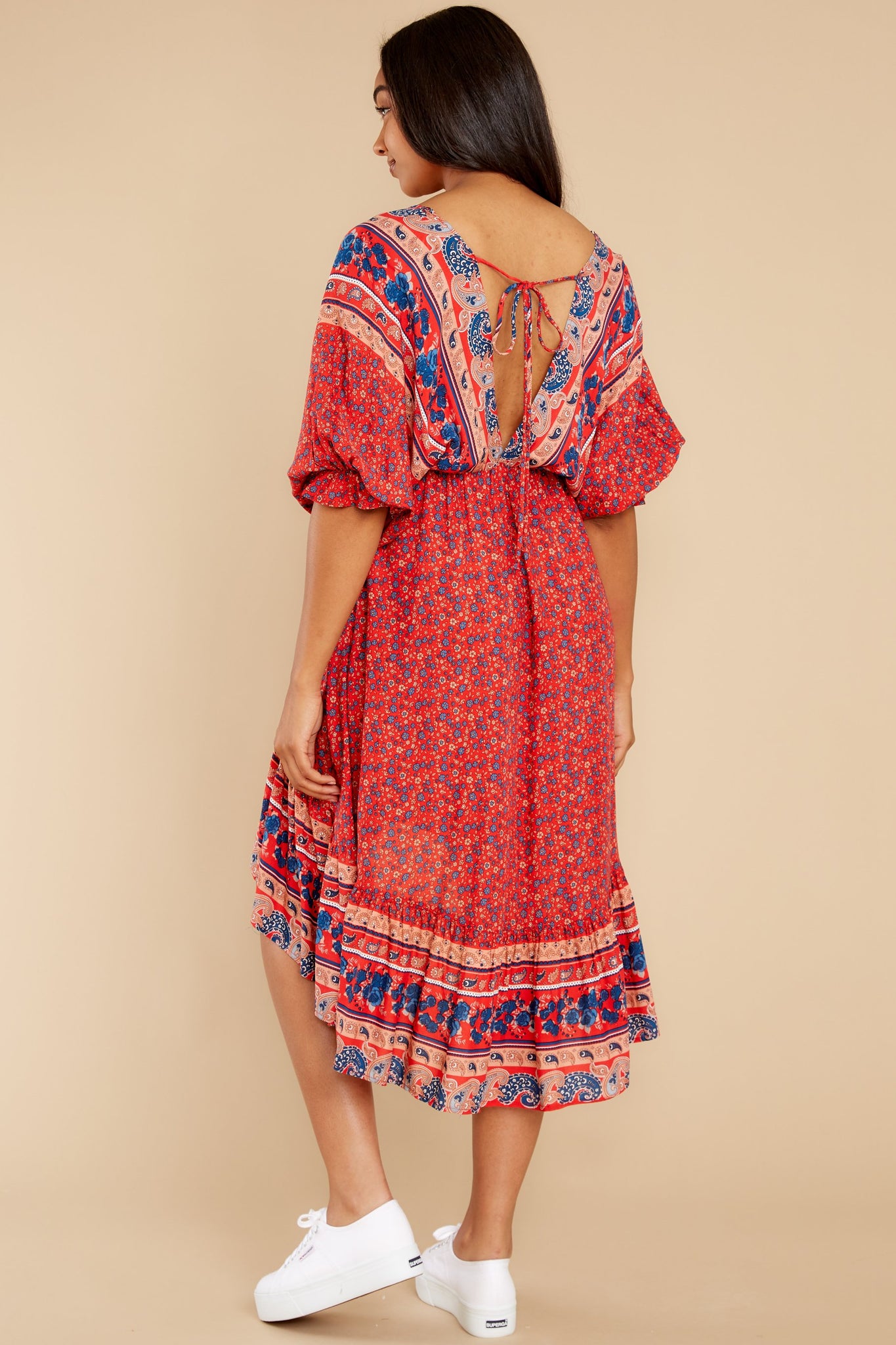 There are many different degrees of adorable. From fluffy bunny kind of cute to you¡¯re afraid your best friend might steal your new dress?from your closet Out Of Envy kind of adorable. This gorgeous high-low dress? Let¡¯s just say you might want to invest in a heavy-duty lock for your closet.?Print dress features a v-neckline accompanied by a modesty snap, an open back detail closed by an attached drawcord detail, short bubble sleeves completed by elastic cuffs, an elastic waistline, and a draped slight high-low hemline. Model is wearing a medium. ? 100% Rayon ? Hand Wash Cold ? Unlined ? Imported