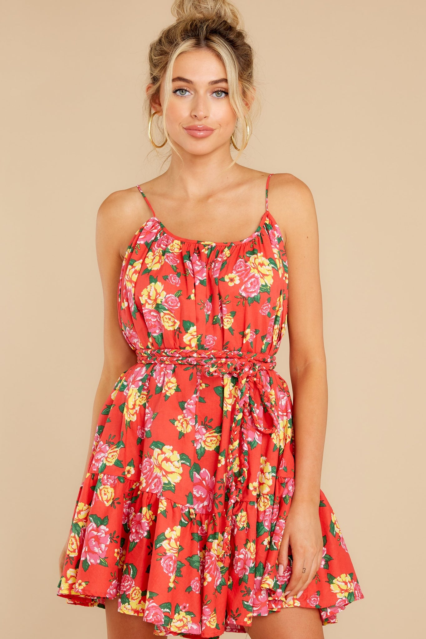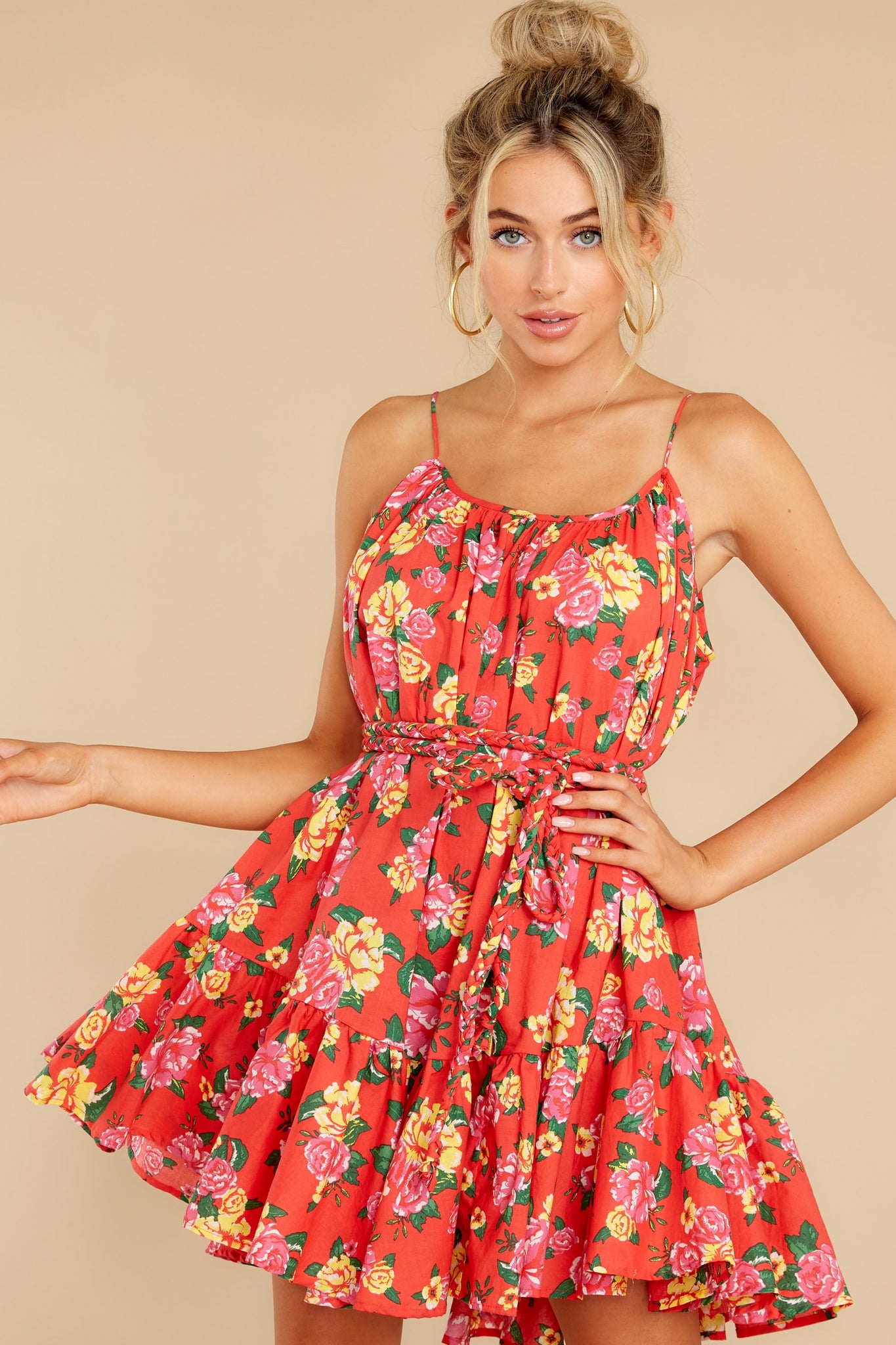 I¡¯ll provide the bait, you be the hook. Together, we¡¯ll land you the best catch ev-ah! You?just need to slip me on, and we'll be?Too Alluring to pass up. Easy peasy. You know I'm the sweetest little dress around. Now, let's go fishing, shall we? Floral print dress features thin (non-adjustable) straps, lightweight material, a matching fabric rope belt for a cinchable waist, and a ruffle godet skirt hemline. Model is wearing a small. ? 100% Cotton ? Hand Wash Cold ? Unlined ? Imported