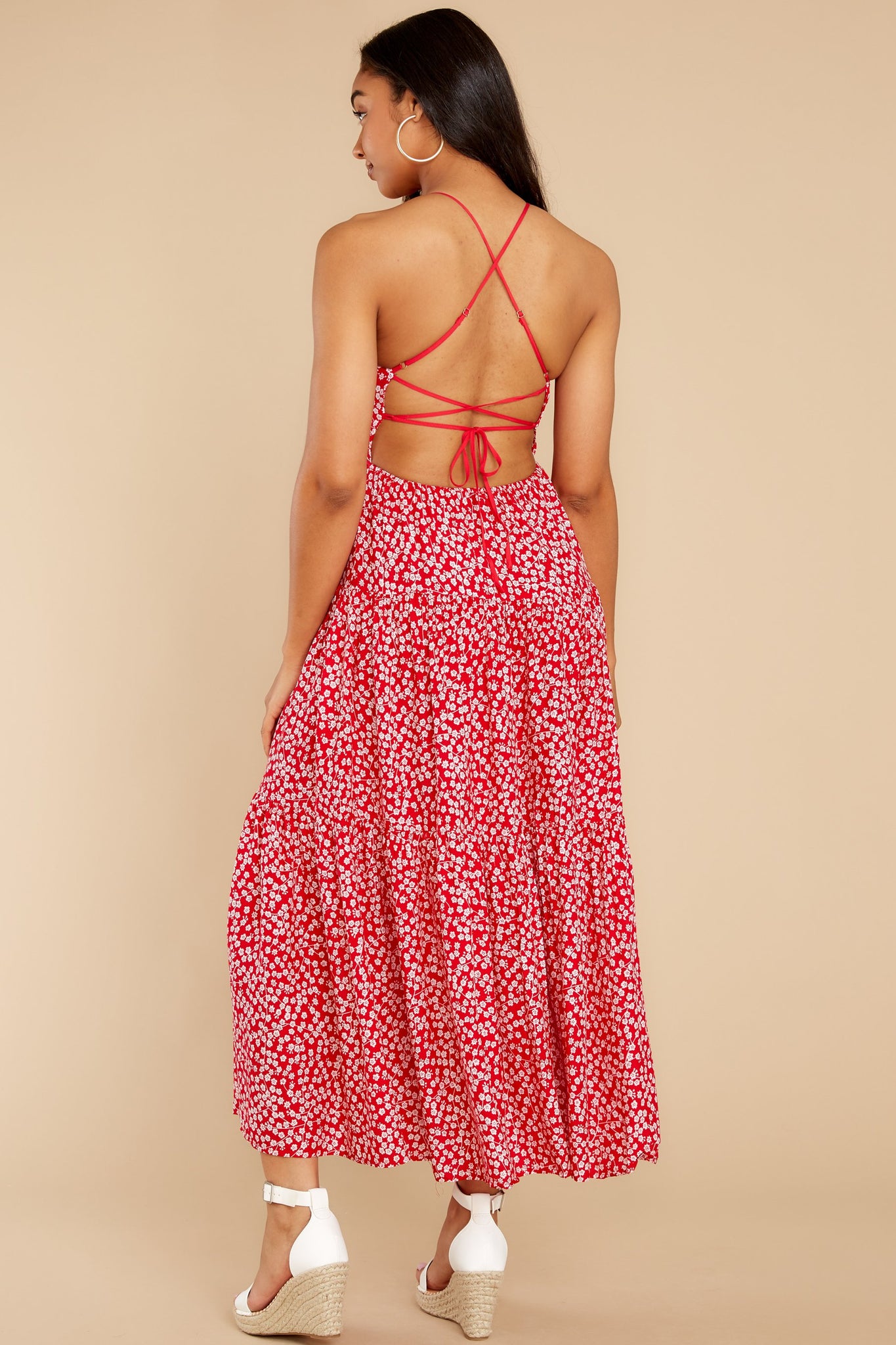 For those days when the weather is Too Perfect not to dine outside, or for the days when all you can dream about are those perfect days, we¡¯ve got you covered. Or this?sunshine ready?maxi dress?does, at the very least. Floral print maxi?dress features thin adjustable criss-cross straps leading to an intricate lace up backing, an elastic lower backline, and a gathered midi skirt. Model is wearing a medium. ? 100% Rayon ? Hand Wash Cold ? Lined ? Imported