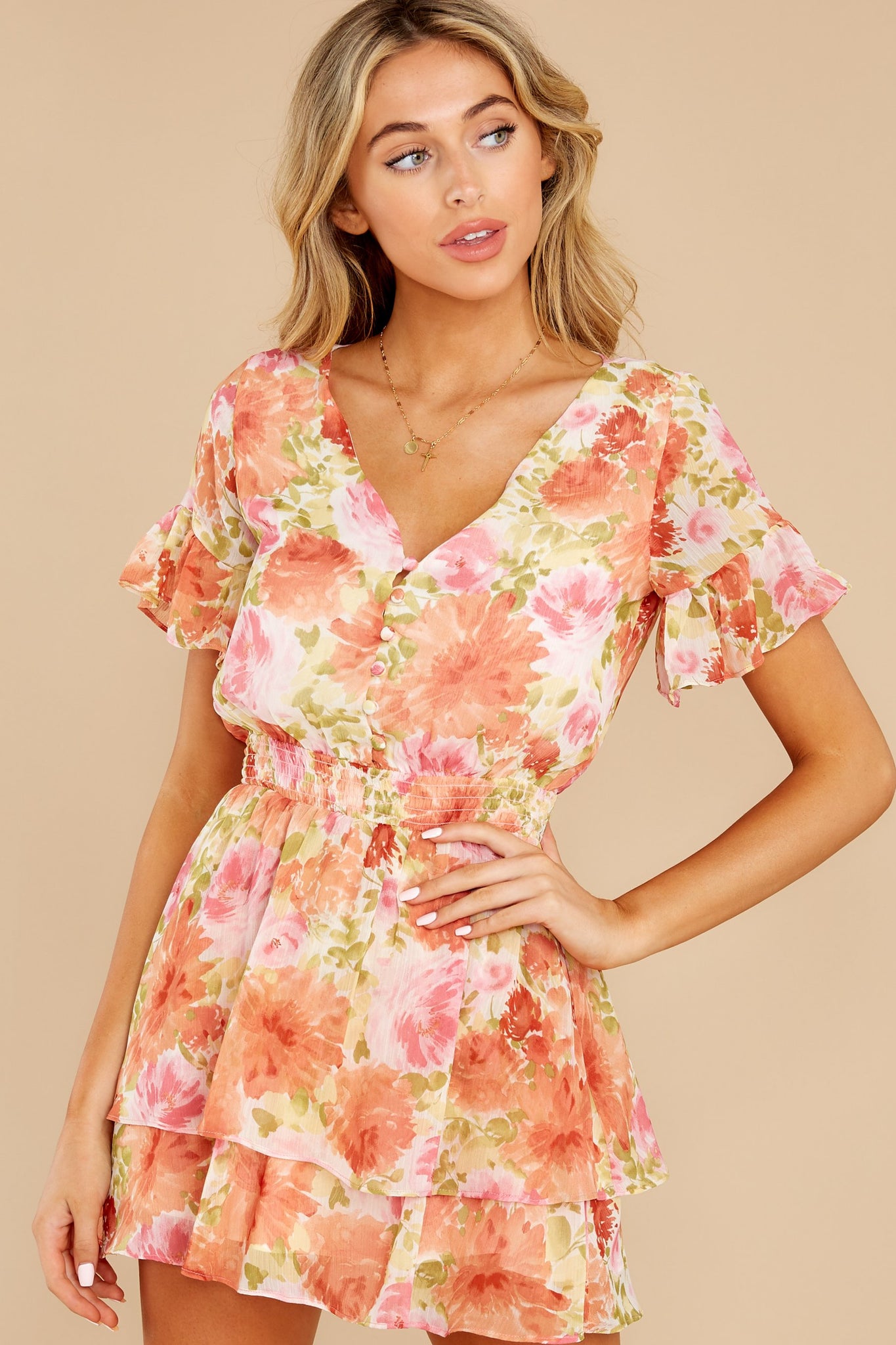 The question of the day will be, "What's Her Secret?" when you step out wearing this delightfully chic dress. No one can say you don't look ravishing,?because you most certainly do! Floral print mini dress features a v-neckline leading into a true button-loop front, short ruffle sleeves, a thick elastic-encased smocked waistband, and a short, layered hemline. Model is wearing a small. ? 100% Rayon ? Dry Clean Only ? Lined ? Imported